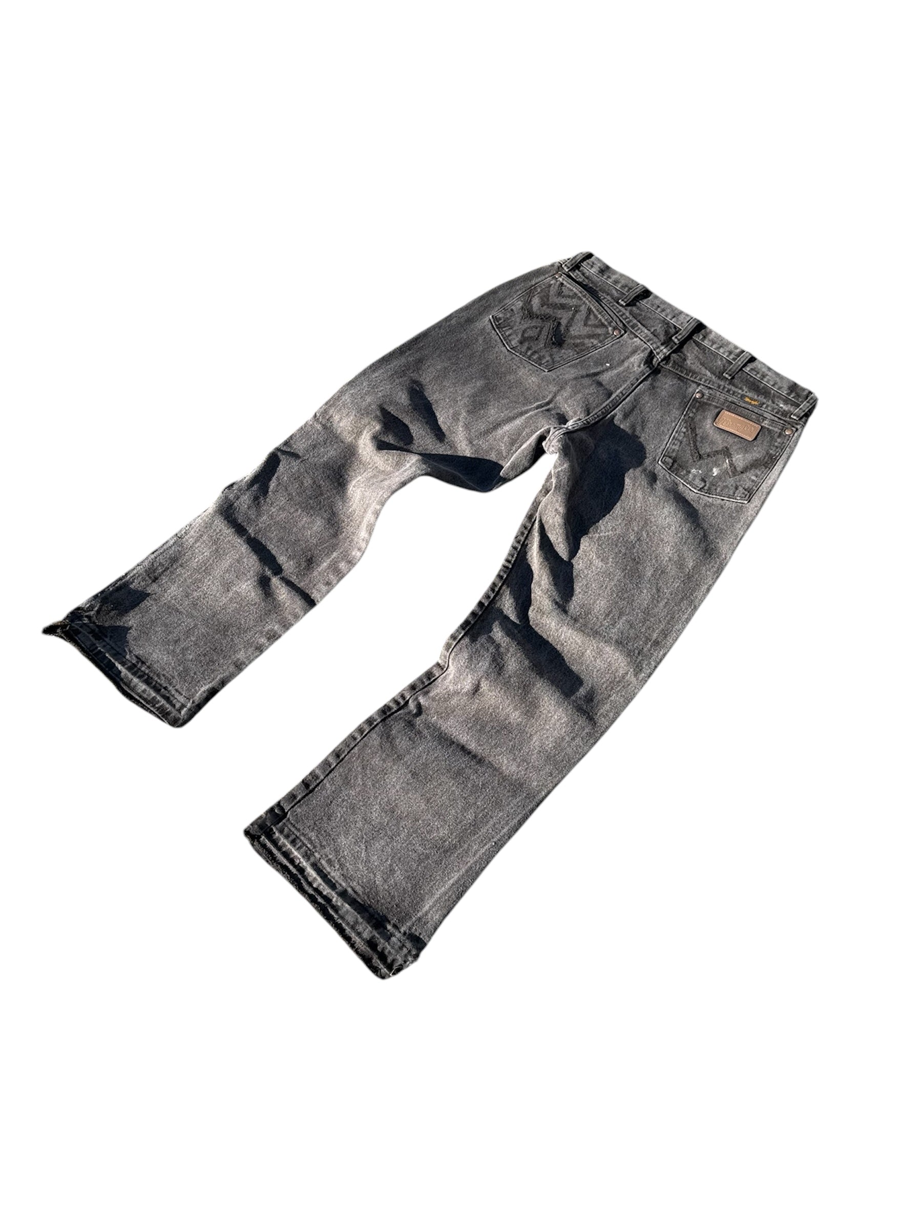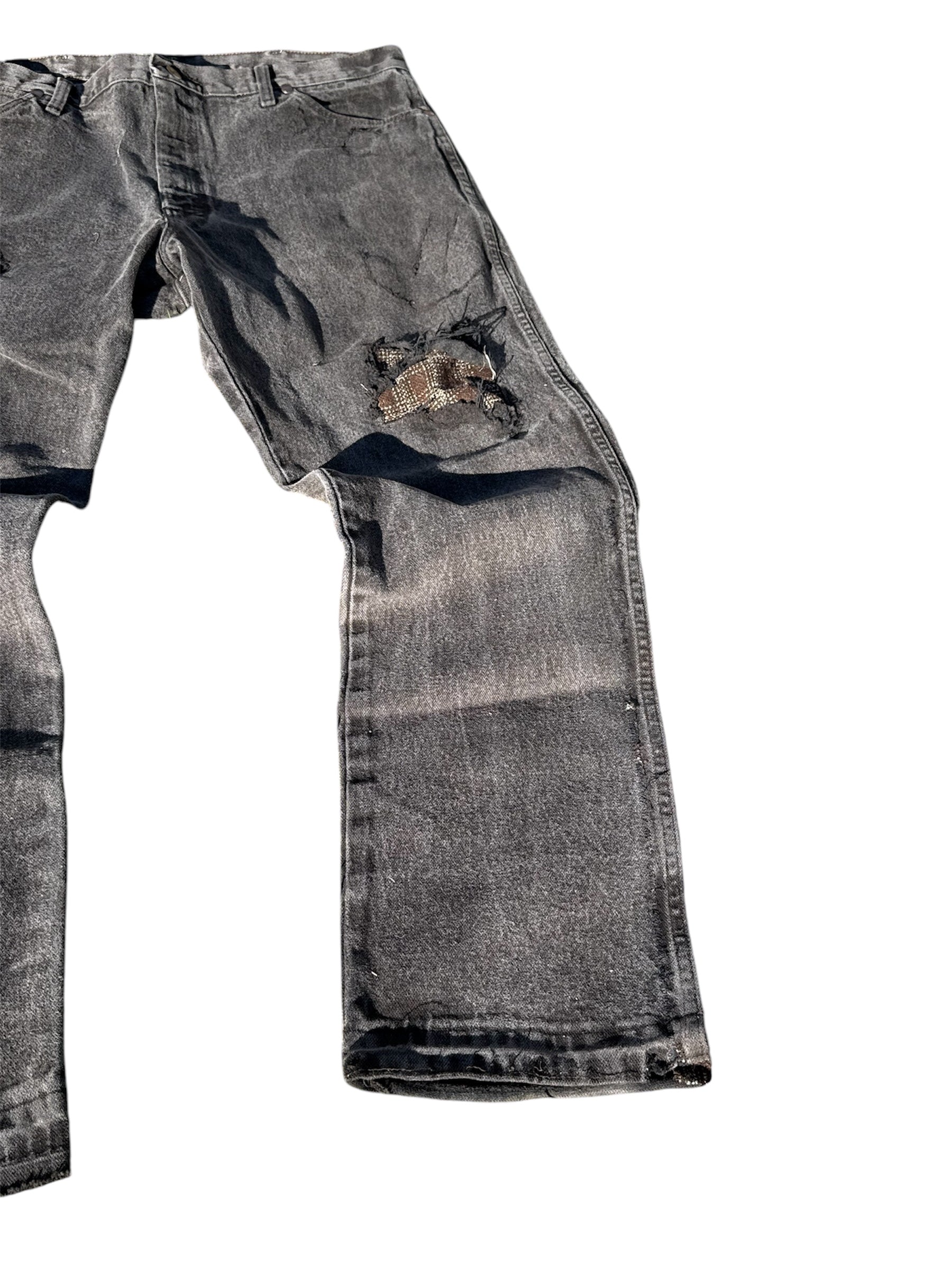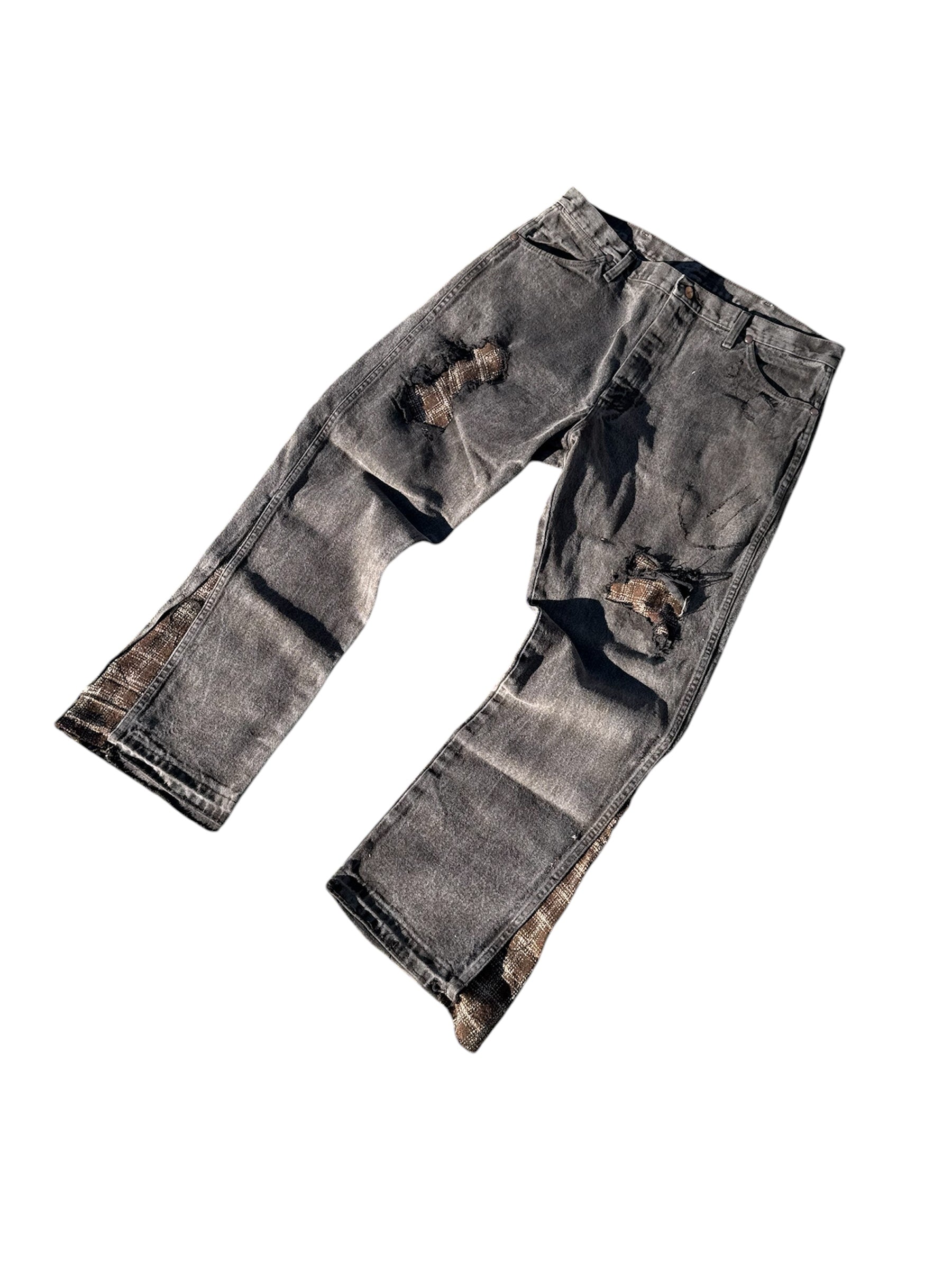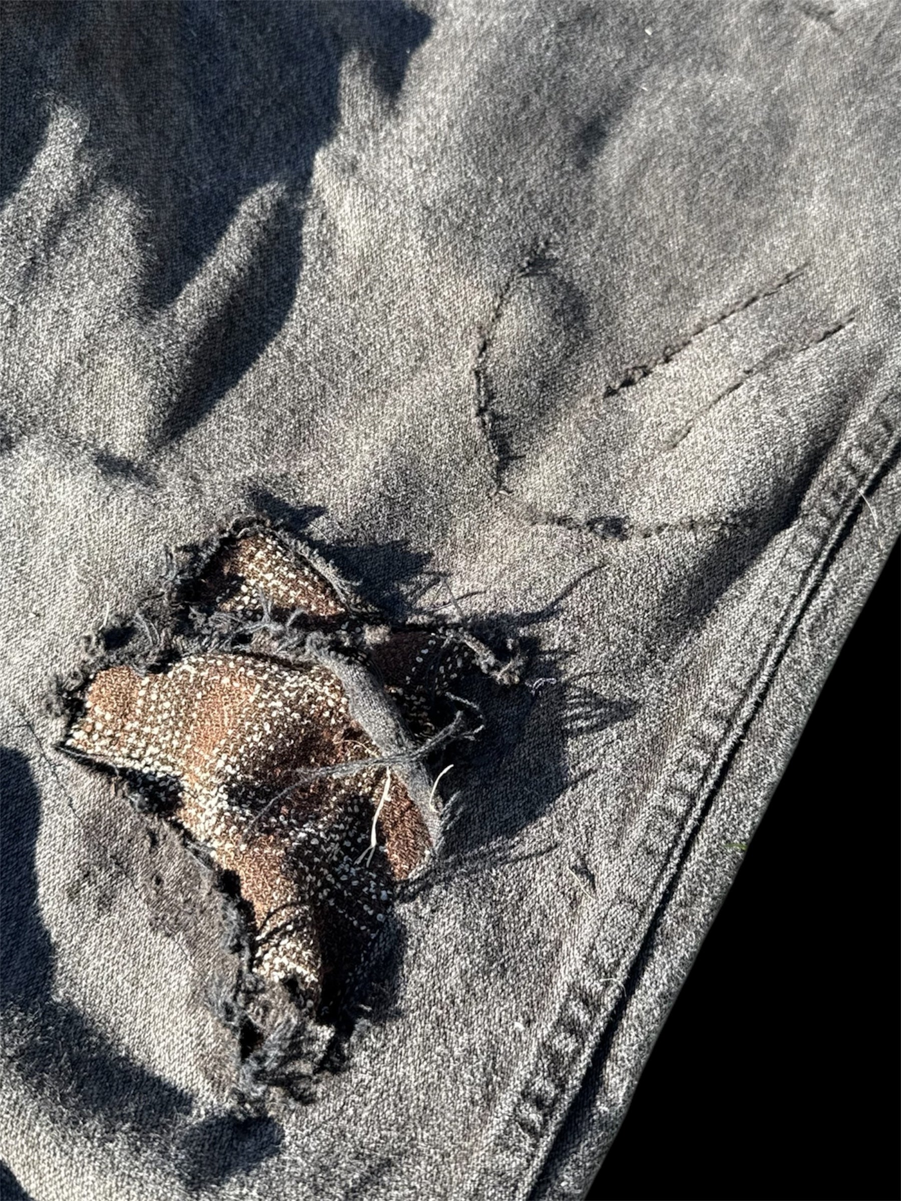 distressing has brown/white fabric underneath to add to that brownish wash on the jeans. flares are made out of same material